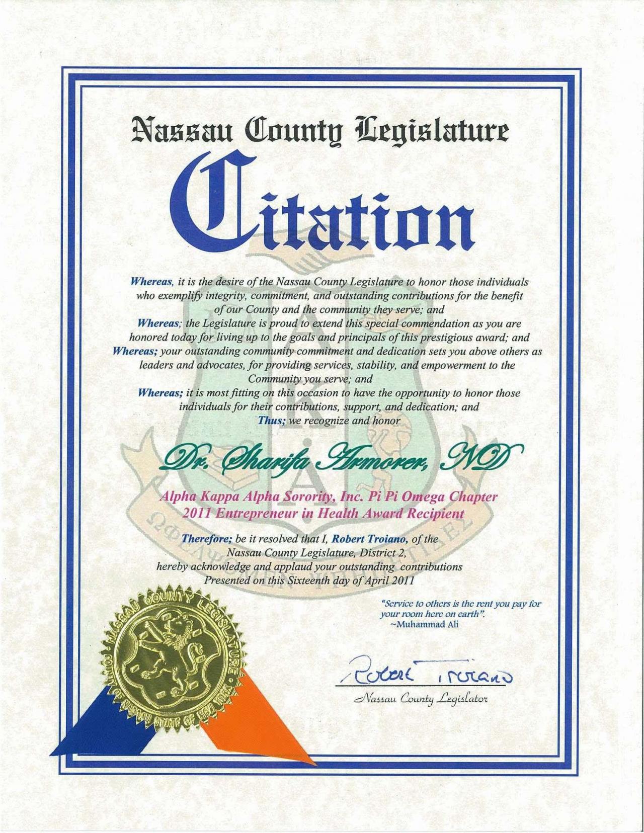 On April 16, 2011 Dr Armorer And Chiron Institute Was Provided The 2011 Entrepreneur Health Award By The Nassau County Legislature.