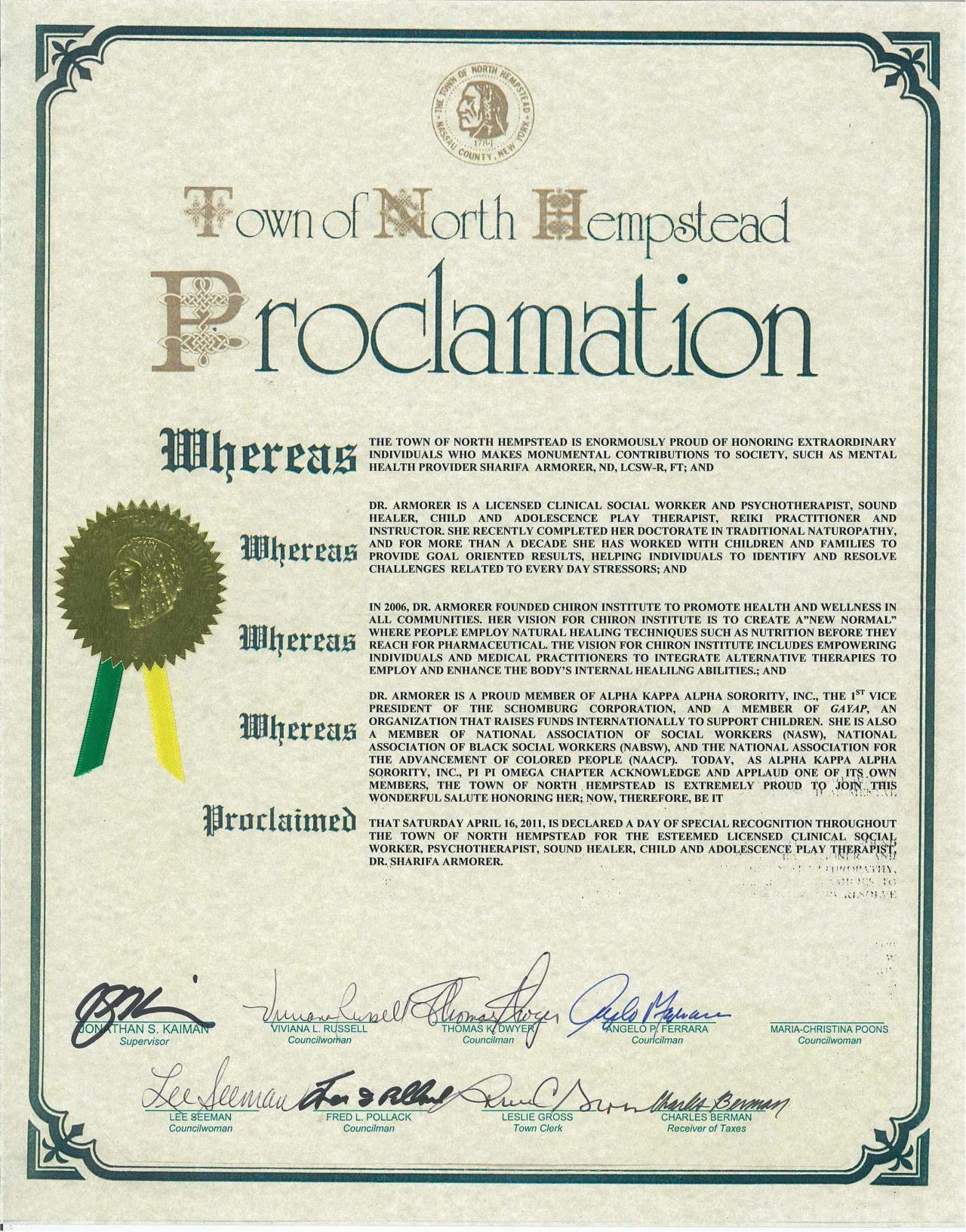 On April 16, 2011 Dr Armorer and Chiron Institute Was Provided A Proclamation By The Town Of North Hempstead LI.