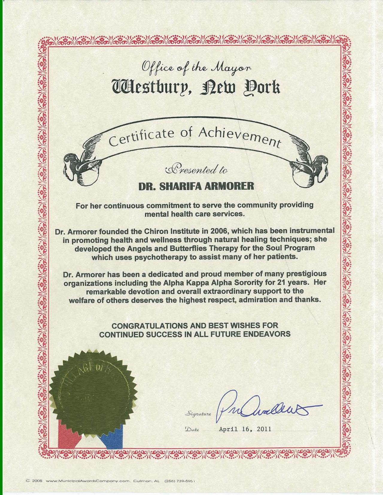 On April 16, 2011 Dr Armorer and Chiron Institute Was Recognized and Awarded A Certificate of Achievement from The Office Of The Mayor In Westbury NY.